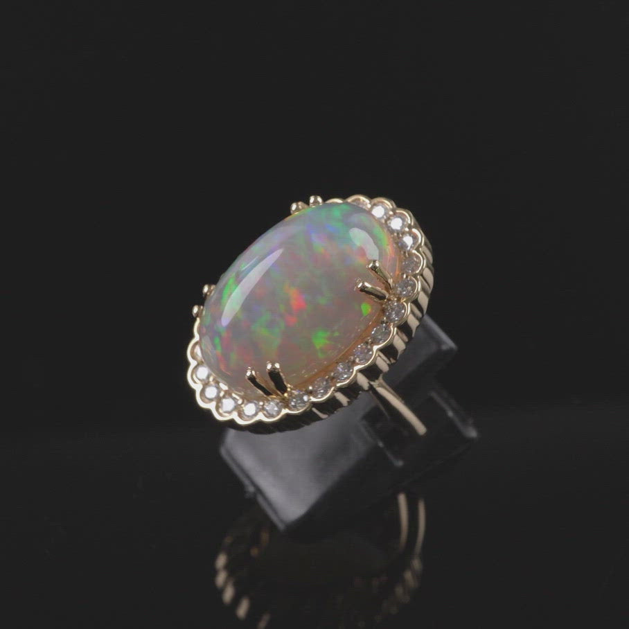 This custom-made opal ring gold and diamond ring features a rare 14.23-carat Ethiopian opal with a natural honeycomb pattern that flashes all rainbow colours intensely over the grey-mottled ground. Photographs of opals are never as good as looking at an opal in real life!