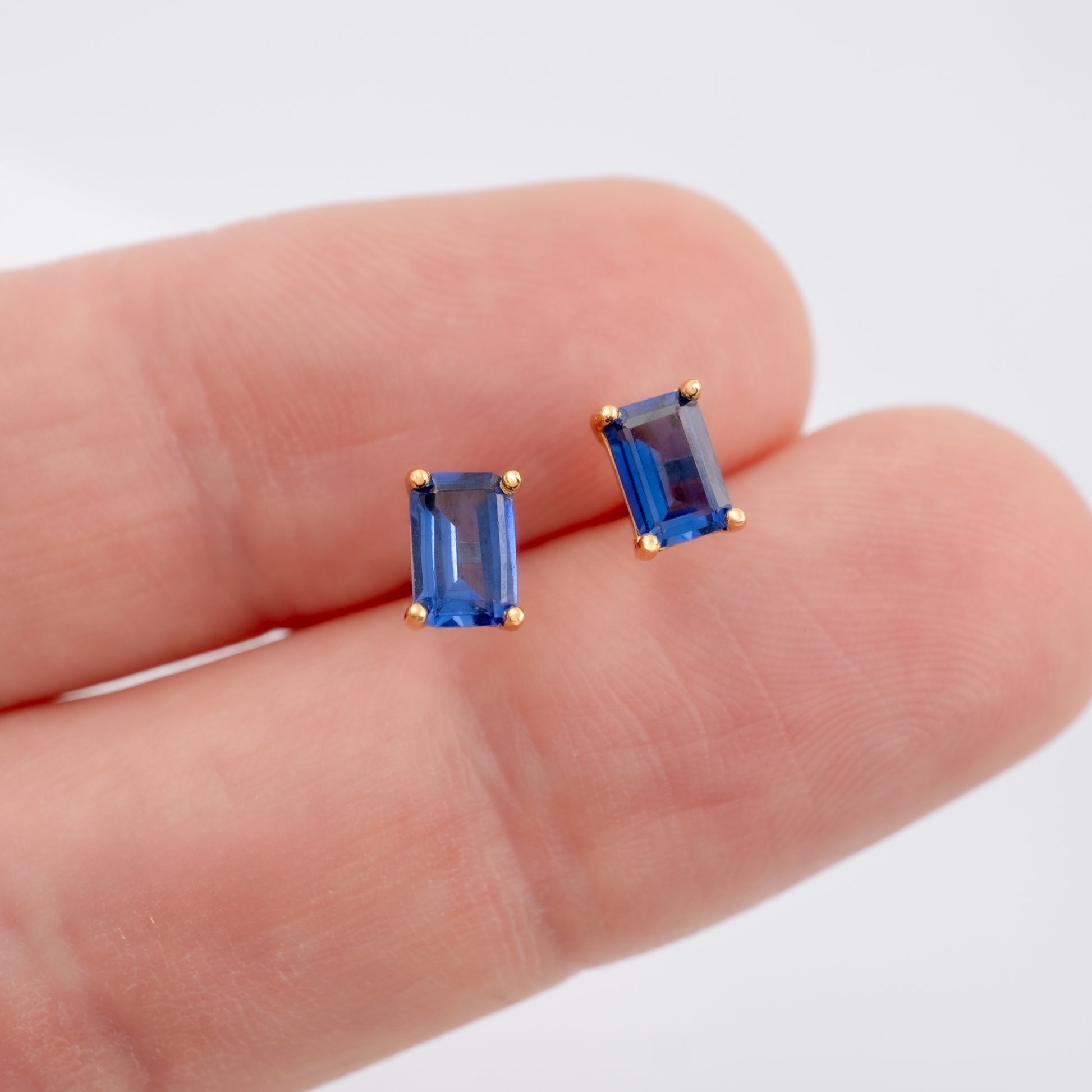 A pair of lab blue sapphire ear studs in yellow gold plated silver. Featuring 6 x 4 mm cornflower blue sapphires, these studs are perfect for daily wear or celebrating September birthdays.