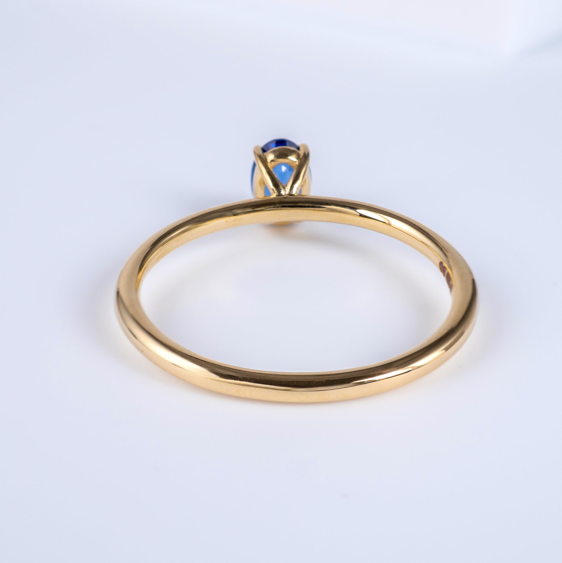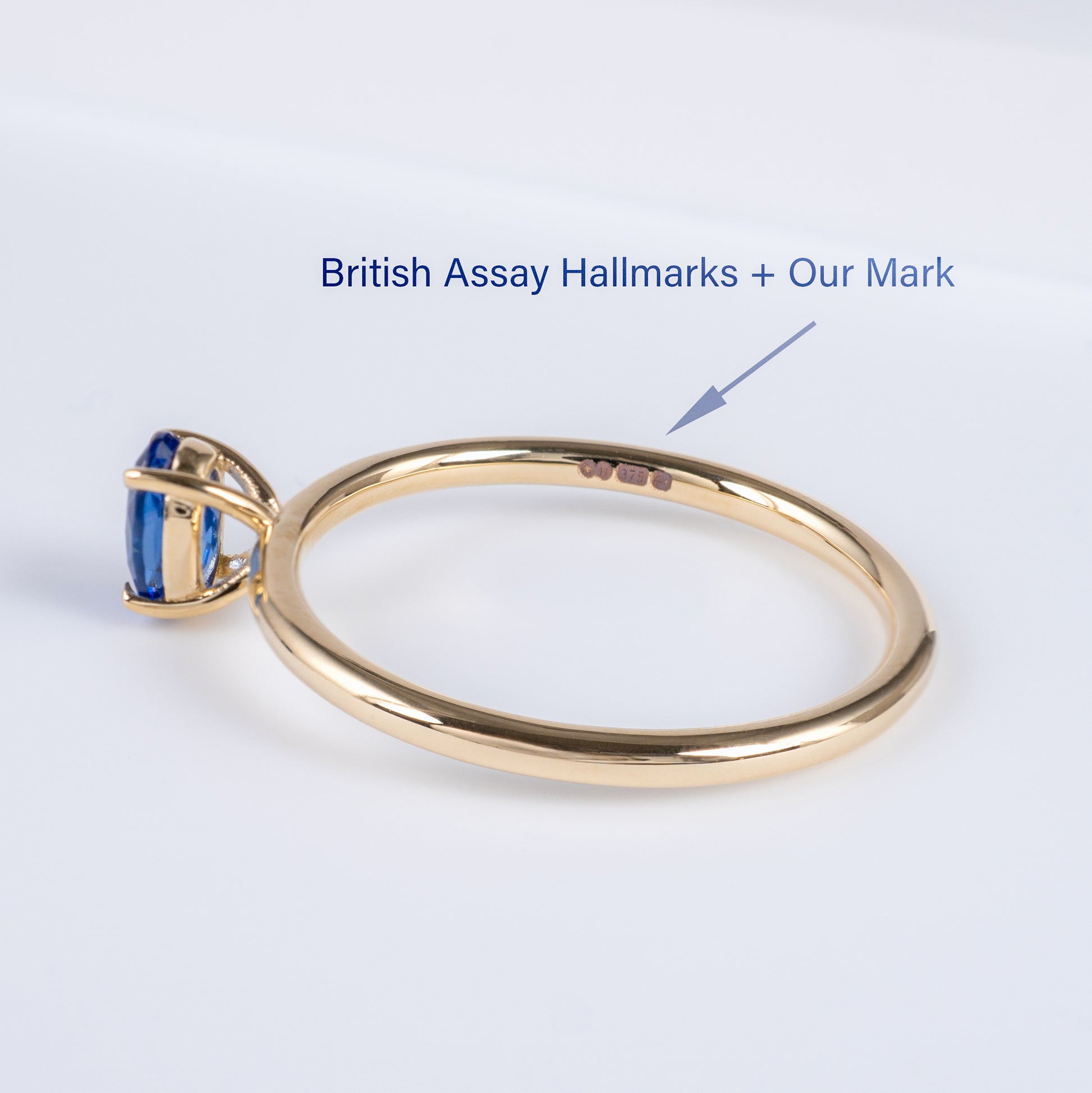 Constructed from 9ct yellow gold, this solitaire sapphire ring boasts an exquisite oval lab-grown cornflower blue sapphire held in place by a tall prong setting. Full British assay office hallmarks ensure the ring's authenticity.