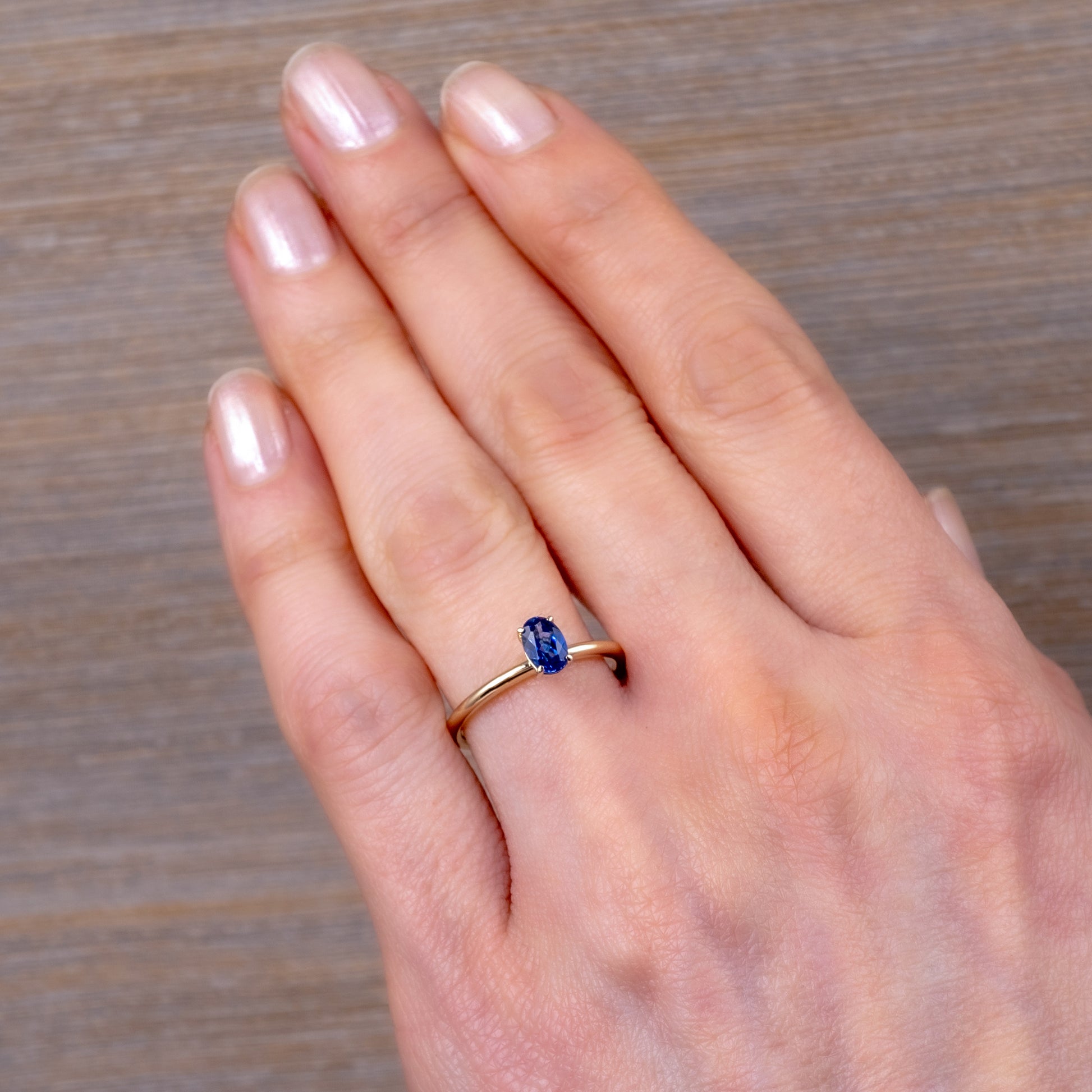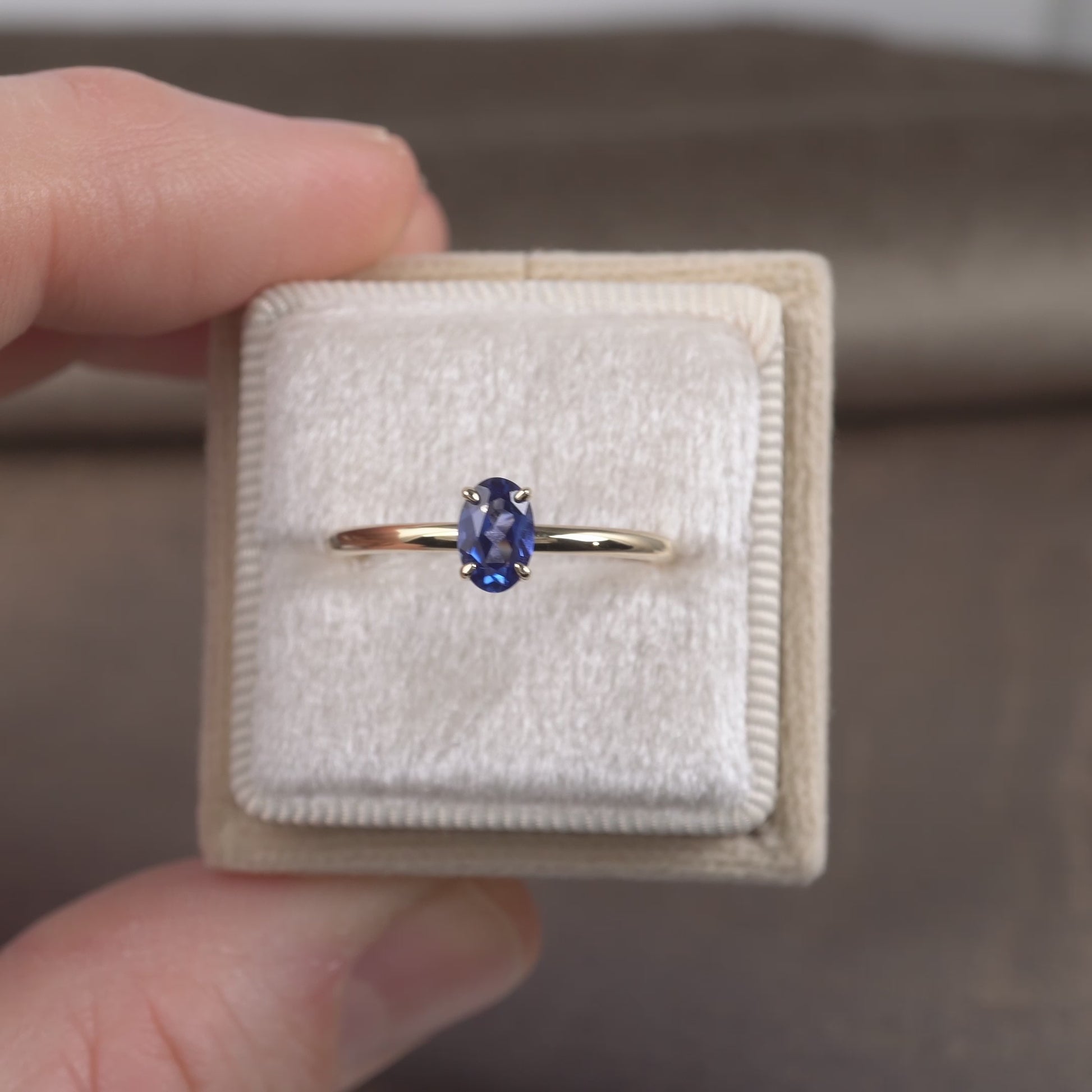 - Gemstone: 5 × 7 mm lab‑grown cornflower‑blue sapphire (~1 ct)