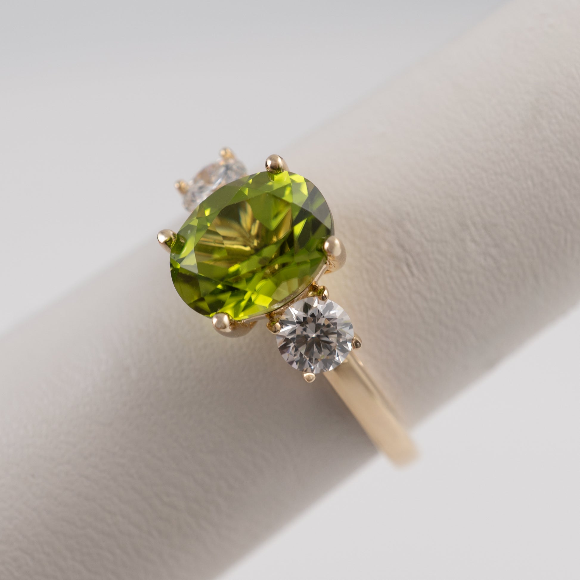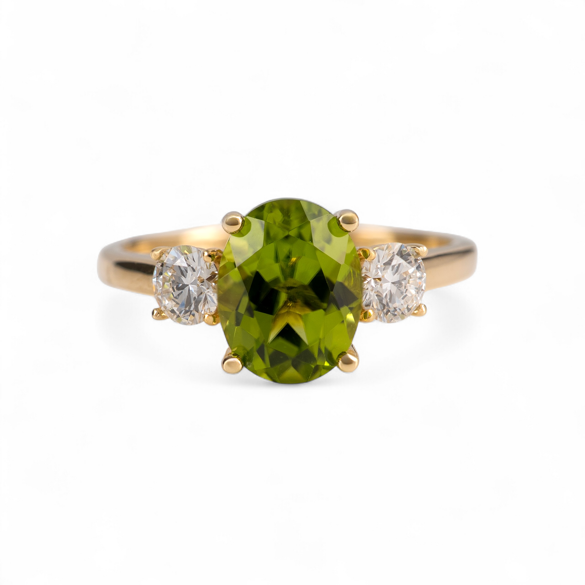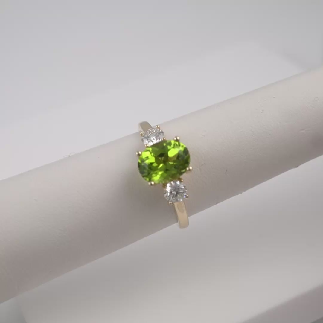 Peridot is the August birthstone and is often linked with renewal, harmony, and prosperity. Its green colour stands out against the bright white diamonds. This is a classic three stone ring style, suitable as an engagement ring or a special gift.