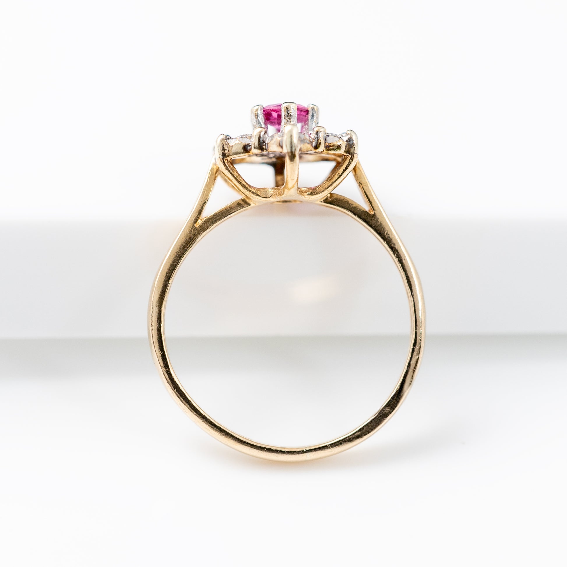 This vintage ruby engagement ring in 9ct yellow gold features a central natural ruby surrounded by diamonds in a white gold halo setting. The elegant floral design, a cathedral shank, and daylight shoulders offer a timeless and sophisticated look.